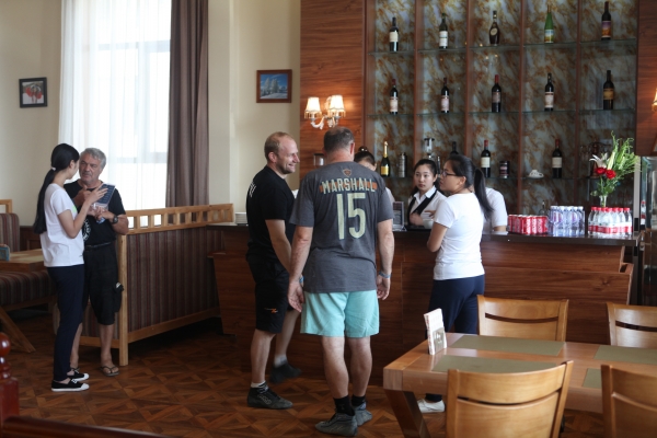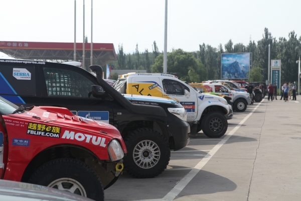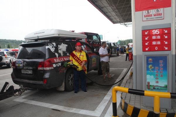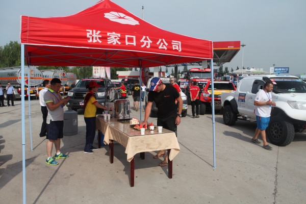 上午8點(diǎn)許,伴隨著陣陣賽車(chē)發(fā)動(dòng)機(jī)的轟鳴聲,比賽車(chē)隊(duì)駛?cè)敕⻊?wù)區(qū)進(jìn)行短暫停留。公司接待小組成員提前在各自崗位等候,保安、餐廳和加油服務(wù)人員各司其職,配合公安武警開(kāi)展停車(chē)引導(dǎo)、飲水和加油服務(wù)。在咖啡廳,賽車(chē)手們喝上了熱咖啡,超市和餐廳門(mén)前也提供了飲用水,忙碌有序的加油站旁邊,剛切開(kāi)的西瓜為選手所青睞……廣播里傳出了悠揚(yáng)的俄羅斯民歌,給長(zhǎng)途奔波的選手們送去了鄉(xiāng)音的慰藉。這些來(lái)自遙遠(yuǎn)異域的粗獷的賽車(chē)手們,紛紛豎起拇指,表達(dá)對(duì)中國(guó)人民熱情接待的謝意。